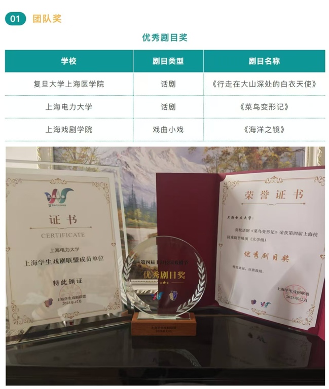 我校大学生话剧团是我校历史最悠久、影响力最广的学生艺术团之一,至今已有21年历史,始终是校园文化建设的重要力量和美育实践的生动载体,他们用戏剧的形式讲述上电故事、展现青年担当,此次载誉而归,不仅是对话剧团长期努力付出的肯定,更是我校长期坚持“以文化人、以美育人”,鼓励学生开展高品质艺术创作与实践成果的一次集中展现。