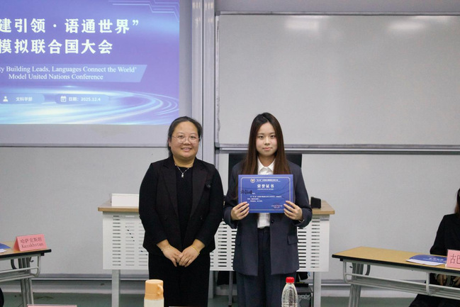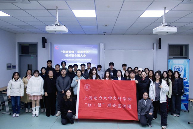 12月4日,文科学部“红·语”理论宣讲团在临港校区主办“党建引领·语通世界”模拟联合国大会。活动围绕语言互通与经济话语能力建设,通过模拟外交流程,展现青年学子的国际视野与担当。文科学部张欲晓、刘军、范俊雄三位老师出席活动,杨杨筱雅、金怡同学担任中英双语主持,30余名学生参与。