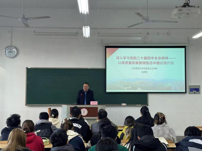 11月18日,华东师范大学速继明教授为学员作《深入学习党的二十届四中全会精神——以高质量发展接续推进中国式现代化》专题辅导报告。讲座立足大历史观,系统梳理了中国式现代化的探索历程与核心内涵,结合党的二十届四中全会审议通过的“十五五”规划建议,深入阐释了治理现代化与高质量发展的内在联系与实践路径。速教授指出,新时代青年要深刻把握“国之大者”,主动将个人理想融入国家发展大局,以“踔厉奋发、勇毅前行”的奋斗姿态,为全面建设社会主义现代化国家贡献青春力量。