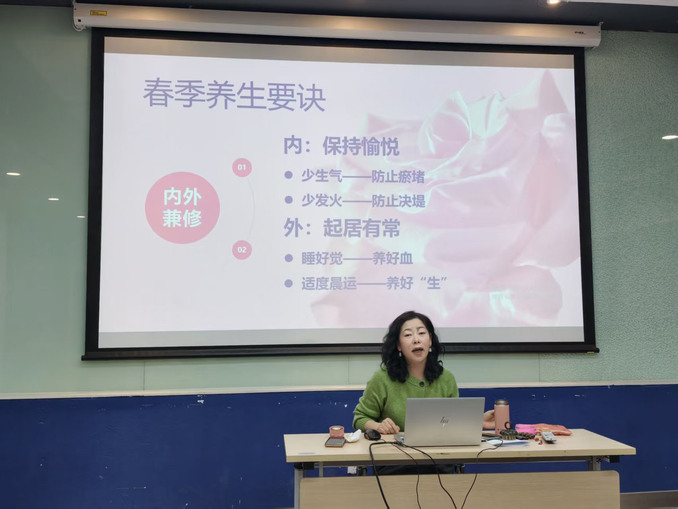 下午3时,讲座在温馨的节日祝福中拉开帷幕。何老师持有中医师资格证,深耕中医养生多年。讲座伊始,她从《黄帝内经·素问·上古天真论》中的养生智慧切入,围绕“养生根本大法”展开分享。她指出,养生需内外兼修:对内要“调畅情志”,做到“恬淡虚无,真气从之”,保持精神内守、情绪平和;对外要“顺时而为”,顺应时令变化调整作息与饮食,正如“虚邪贼风,避之有时”所言,懂得规避外邪、养护正气。何老师结合春季气候特点,深入浅出地讲解了情志与健康的关系、时令对身体的影响,帮助老师们在日常生活中更好地关照自身。