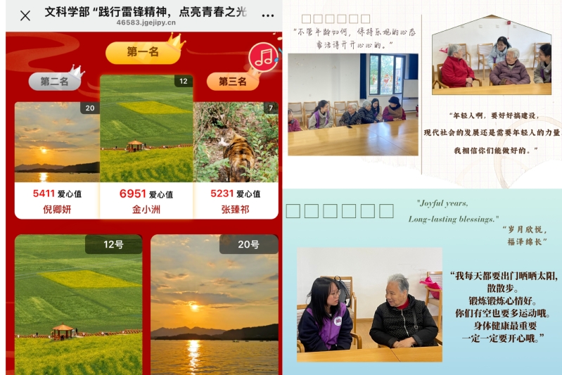 春风送暖,校园涌动学雷锋热潮。为深入学习雷锋同志全心全意为人民服务的精神品质,进一步弘扬“奉献、友爱、互助、进步”的志愿服务精神,文科学部于3月份开展传承雷锋精神系列志愿服务活动,引导文科学子用青春行动诠释雷锋精神的时代内涵,做到内化于心、外化于行。